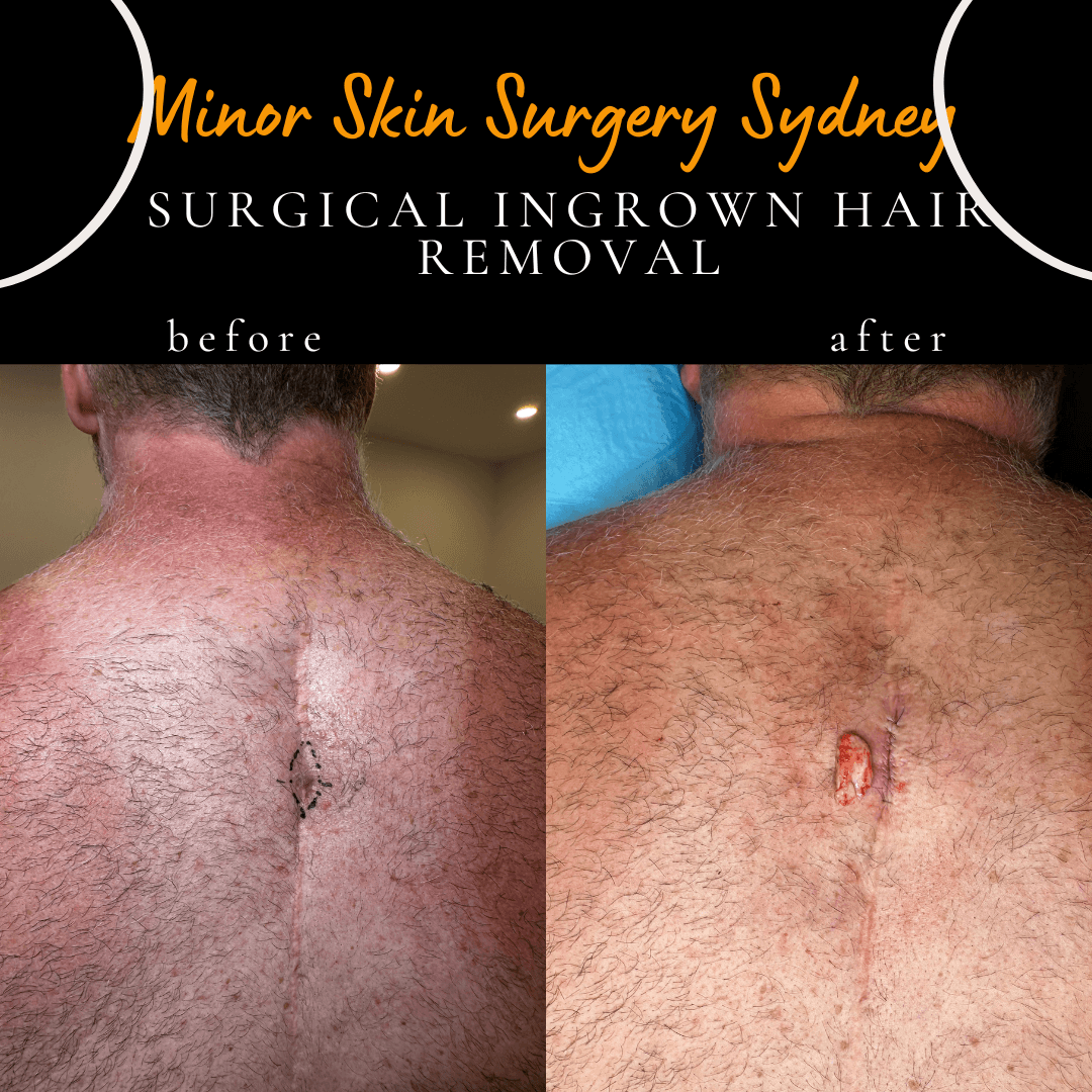 This patient had an ingrown hair in the middle of the upper back, causing recurrent infections and abscess formation. After repeated flare-ups, the condition was resolved with surgical excision under local anesthesia.