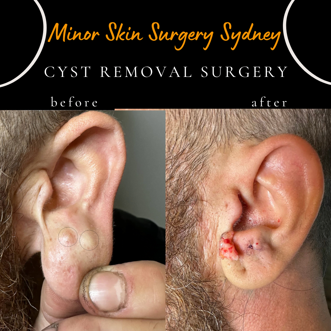 A slowly growing mole in the ear over six months, painless and without discharge, was removed under local anesthesia. It was sent to pathology for diagnosis.There were two cysts side by side in the earlobe. The cysts were removed from the back of the ear to conceal the scar. The cyst was initially removed several years ago by another surgeon in Westmead, but it recurred. Dr. Kim removed the cyst under local anesthesia. The most important factor in reducing the recurrence rate is the completeness of cyst excision during surgery. The cyst was completely removed, and it should not recur.A mole was removed from the ear under local anaesthesia.Cyst removal surgery from the back of the ear. This is an epidermal cyst.